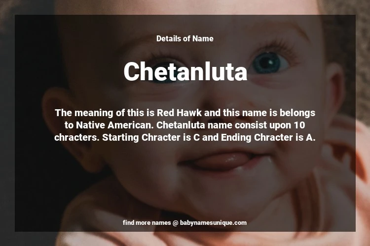 The name Chetanluta is chosen by those who are willing to find Unique Boy Baby Names. The meaning of this is Red Hawk and this name is belongs to Native American Origin. Baby Name Chetanluta consist upon 10 chracters. Starting alphabet is C and ending alphabet is A. This name is used primarily by parents who are considering unique baby names for Boy. The Zodiac Sign suitbale for this name are;