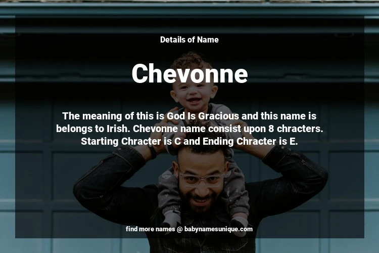 The name Chevonne is chosen by those who are willing to find Unique Transgenders Baby Names. The meaning of this is God Is Gracious and this name is belongs to Irish Origin. Baby Name Chevonne consist upon 8 chracters. Starting alphabet is C and ending alphabet is E. This name is used primarily by parents who are considering unique baby names for Transgenders. The Zodiac Sign suitbale for this name are;