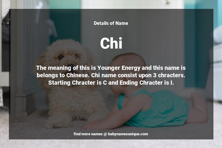 The name Chi is chosen by those who are willing to find Unique Boy Baby Names. The meaning of this is Younger Energy and this name is belongs to Chinese Origin. Baby Name Chi consist upon 3 chracters. Starting alphabet is C and ending alphabet is I. This name is used primarily by parents who are considering unique baby names for Boy. The Zodiac Sign suitbale for this name are;