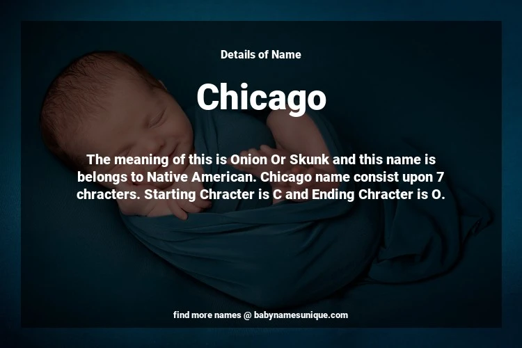 The name Chicago is chosen by those who are willing to find Unique Transgenders Baby Names. The meaning of this is Onion Or Skunk and this name is belongs to Native American Origin. Baby Name Chicago consist upon 7 chracters. Starting alphabet is C and ending alphabet is O. This name is used primarily by parents who are considering unique baby names for Transgenders. The Zodiac Sign suitbale for this name are;