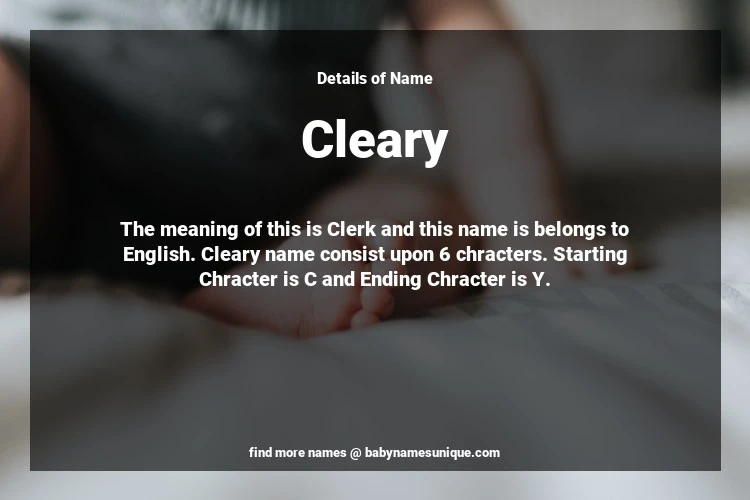 The name Cleary is chosen by those who are willing to find Unique Transgenders Baby Names. The meaning of this is Clerk and this name is belongs to English Origin. Baby Name Cleary consist upon 6 chracters. Starting alphabet is C and ending alphabet is Y. This name is used primarily by parents who are considering unique baby names for Transgenders. The Zodiac Sign suitbale for this name are;