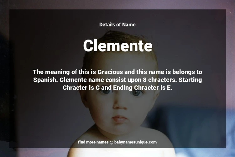 The name Clemente is chosen by those who are willing to find Unique Boy Baby Names. The meaning of this is Gracious and this name is belongs to Spanish Origin. Baby Name Clemente consist upon 8 chracters. Starting alphabet is C and ending alphabet is E. This name is used primarily by parents who are considering unique baby names for Boy. The Zodiac Sign suitbale for this name are;