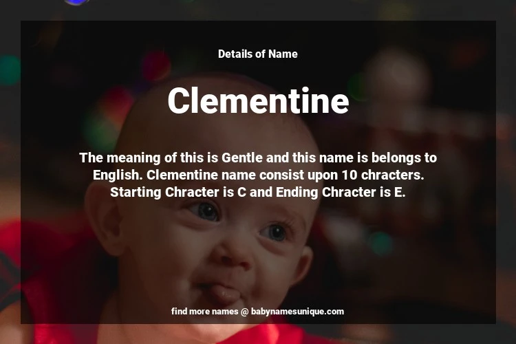 The name Clementine is chosen by those who are willing to find Unique Transgenders Baby Names. The meaning of this is Gentle and this name is belongs to English Origin. Baby Name Clementine consist upon 10 chracters. Starting alphabet is C and ending alphabet is E. This name is used primarily by parents who are considering unique baby names for Transgenders. The Zodiac Sign suitbale for this name are;