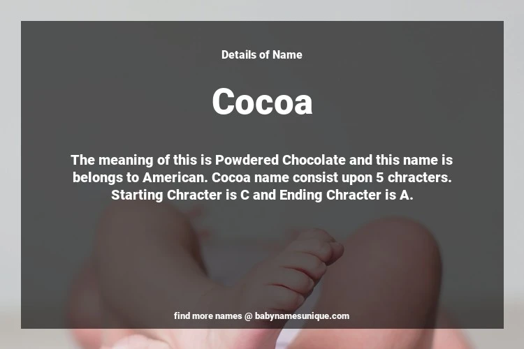 The name Cocoa is chosen by those who are willing to find Unique Transgenders Baby Names. The meaning of this is Powdered Chocolate and this name is belongs to American Origin. Baby Name Cocoa consist upon 5 chracters. Starting alphabet is C and ending alphabet is A. This name is used primarily by parents who are considering unique baby names for Transgenders. The Zodiac Sign suitbale for this name are;