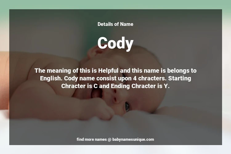 The name Cody is chosen by those who are willing to find Unique Boy Baby Names. The meaning of this is Helpful and this name is belongs to English Origin. Baby Name Cody consist upon 4 chracters. Starting alphabet is C and ending alphabet is Y. This name is used primarily by parents who are considering unique baby names for Boy. The Zodiac Sign suitbale for this name are;