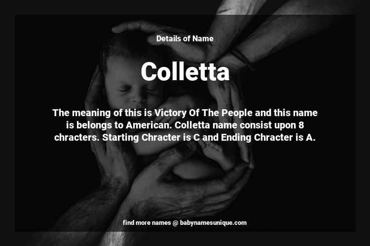 The name Colletta is chosen by those who are willing to find Unique Transgenders Baby Names. The meaning of this is Victory Of The People and this name is belongs to American Origin. Baby Name Colletta consist upon 8 chracters. Starting alphabet is C and ending alphabet is A. This name is used primarily by parents who are considering unique baby names for Transgenders. The Zodiac Sign suitbale for this name are;