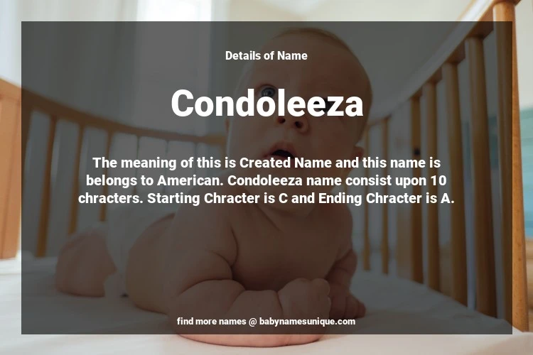 The name Condoleeza is chosen by those who are willing to find Unique Transgenders Baby Names. The meaning of this is Created Name and this name is belongs to American Origin. Baby Name Condoleeza consist upon 10 chracters. Starting alphabet is C and ending alphabet is A. This name is used primarily by parents who are considering unique baby names for Transgenders. The Zodiac Sign suitbale for this name are;