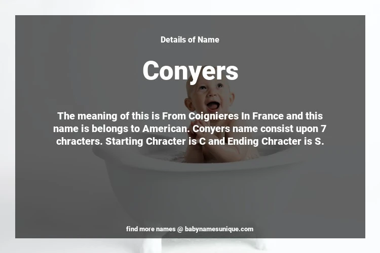 The name Conyers is chosen by those who are willing to find Unique Boy Baby Names. The meaning of this is From Coignieres In France and this name is belongs to American Origin. Baby Name Conyers consist upon 7 chracters. Starting alphabet is C and ending alphabet is S. This name is used primarily by parents who are considering unique baby names for Boy. The Zodiac Sign suitbale for this name are;