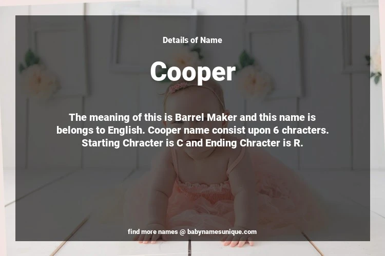 The name Cooper is chosen by those who are willing to find Unique Transgenders Baby Names. The meaning of this is Barrel Maker and this name is belongs to English Origin. Baby Name Cooper consist upon 6 chracters. Starting alphabet is C and ending alphabet is R. This name is used primarily by parents who are considering unique baby names for Transgenders. The Zodiac Sign suitbale for this name are;