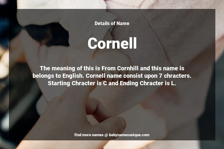 The name Cornell is chosen by those who are willing to find Unique Boy Baby Names. The meaning of this is From Cornhill and this name is belongs to English Origin. Baby Name Cornell consist upon 7 chracters. Starting alphabet is C and ending alphabet is L. This name is used primarily by parents who are considering unique baby names for Boy. The Zodiac Sign suitbale for this name are;