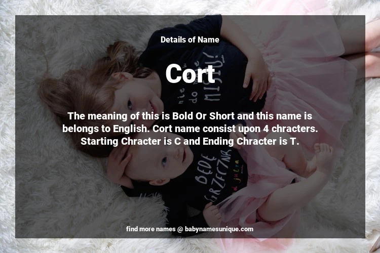 The name Cort is chosen by those who are willing to find Unique Boy Baby Names. The meaning of this is Bold Or Short and this name is belongs to English Origin. Baby Name Cort consist upon 4 chracters. Starting alphabet is C and ending alphabet is T. This name is used primarily by parents who are considering unique baby names for Boy. The Zodiac Sign suitbale for this name are;