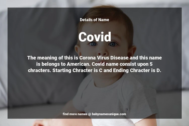 The name Covid is chosen by those who are willing to find Unique Transgenders Baby Names. The meaning of this is Corona Virus Disease and this name is belongs to American Origin. Baby Name Covid consist upon 5 chracters. Starting alphabet is C and ending alphabet is D. This name is used primarily by parents who are considering unique baby names for Transgenders. The Zodiac Sign suitbale for this name are;
