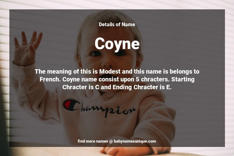 The name Coyne is chosen by those who are willing to find Unique Boy Baby Names. The meaning of this is Modest and this name is belongs to French Origin. Baby Name Coyne consist upon 5 chracters. Starting alphabet is C and ending alphabet is E. This name is used primarily by parents who are considering unique baby names for Boy. The Zodiac Sign suitbale for this name are;