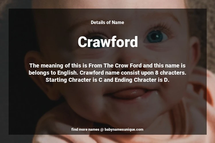 The name Crawford is chosen by those who are willing to find Unique Boy Baby Names. The meaning of this is From The Crow Ford and this name is belongs to English Origin. Baby Name Crawford consist upon 8 chracters. Starting alphabet is C and ending alphabet is D. This name is used primarily by parents who are considering unique baby names for Boy. The Zodiac Sign suitbale for this name are;