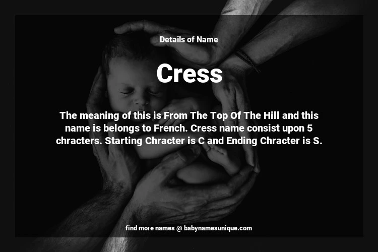 The name Cress is chosen by those who are willing to find Unique Transgenders Baby Names. The meaning of this is From The Top Of The Hill and this name is belongs to French Origin. Baby Name Cress consist upon 5 chracters. Starting alphabet is C and ending alphabet is S. This name is used primarily by parents who are considering unique baby names for Transgenders. The Zodiac Sign suitbale for this name are;