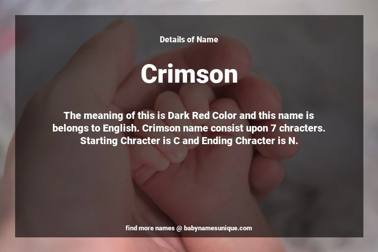 The name Crimson is chosen by those who are willing to find Unique Transgenders Baby Names. The meaning of this is Dark Red Color and this name is belongs to English Origin. Baby Name Crimson consist upon 7 chracters. Starting alphabet is C and ending alphabet is N. This name is used primarily by parents who are considering unique baby names for Transgenders. The Zodiac Sign suitbale for this name are;