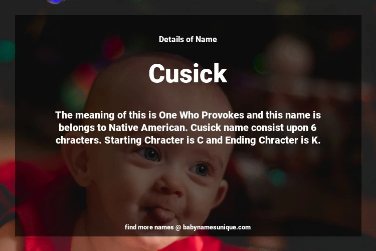 The name Cusick is chosen by those who are willing to find Unique Boy Baby Names. The meaning of this is One Who Provokes and this name is belongs to Native American Origin. Baby Name Cusick consist upon 6 chracters. Starting alphabet is C and ending alphabet is K. This name is used primarily by parents who are considering unique baby names for Boy. The Zodiac Sign suitbale for this name are;