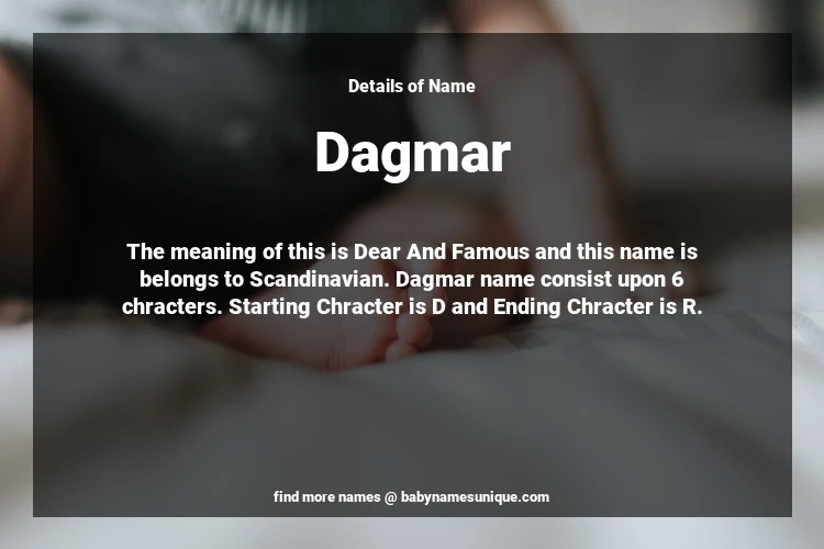 The name Dagmar is chosen by those who are willing to find Unique Transgenders Baby Names. The meaning of this is Dear And Famous and this name is belongs to Scandinavian Origin. Baby Name Dagmar consist upon 6 chracters. Starting alphabet is D and ending alphabet is R. This name is used primarily by parents who are considering unique baby names for Transgenders. The Zodiac Sign suitbale for this name are;