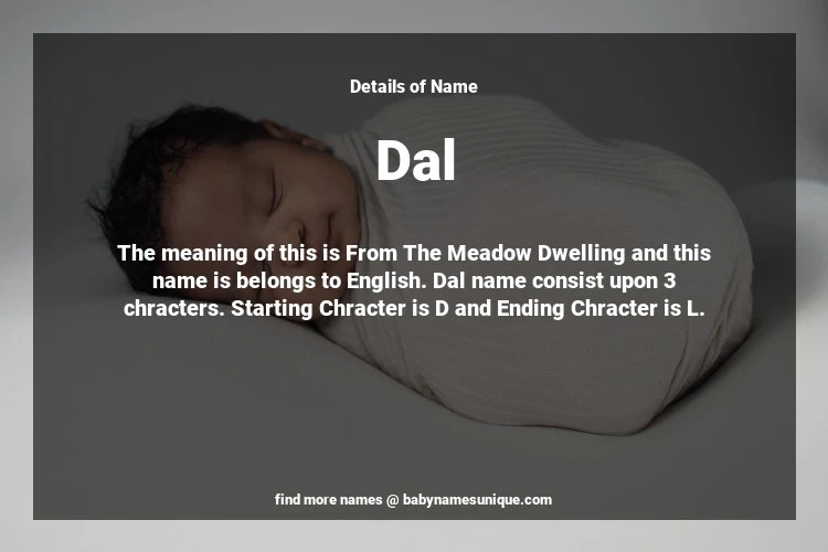 The name Dal is chosen by those who are willing to find Unique Boy Baby Names. The meaning of this is From The Meadow Dwelling and this name is belongs to English Origin. Baby Name Dal consist upon 3 chracters. Starting alphabet is D and ending alphabet is L. This name is used primarily by parents who are considering unique baby names for Boy. The Zodiac Sign suitbale for this name are;
