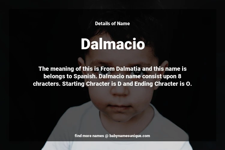 The name Dalmacio is chosen by those who are willing to find Unique Boy Baby Names. The meaning of this is From Dalmatia and this name is belongs to Spanish Origin. Baby Name Dalmacio consist upon 8 chracters. Starting alphabet is D and ending alphabet is O. This name is used primarily by parents who are considering unique baby names for Boy. The Zodiac Sign suitbale for this name are;