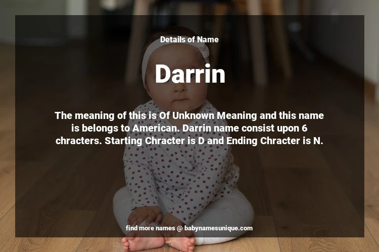 The name Darrin is chosen by those who are willing to find Unique Boy Baby Names. The meaning of this is Of Unknown Meaning and this name is belongs to American Origin. Baby Name Darrin consist upon 6 chracters. Starting alphabet is D and ending alphabet is N. This name is used primarily by parents who are considering unique baby names for Boy. The Zodiac Sign suitbale for this name are;