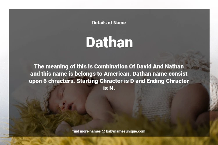 The name Dathan is chosen by those who are willing to find Unique Boy Baby Names. The meaning of this is Combination Of David And Nathan and this name is belongs to American Origin. Baby Name Dathan consist upon 6 chracters. Starting alphabet is D and ending alphabet is N. This name is used primarily by parents who are considering unique baby names for Boy. The Zodiac Sign suitbale for this name are;