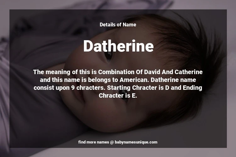 The name Datherine is chosen by those who are willing to find Unique Transgenders Baby Names. The meaning of this is Combination Of David And Catherine and this name is belongs to American Origin. Baby Name Datherine consist upon 9 chracters. Starting alphabet is D and ending alphabet is E. This name is used primarily by parents who are considering unique baby names for Transgenders. The Zodiac Sign suitbale for this name are;