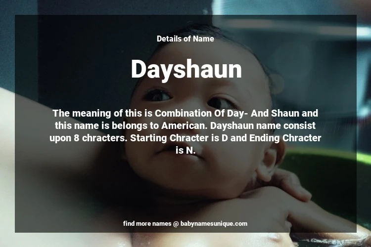 The name Dayshaun is chosen by those who are willing to find Unique Boy Baby Names. The meaning of this is Combination Of Day- And Shaun and this name is belongs to American Origin. Baby Name Dayshaun consist upon 8 chracters. Starting alphabet is D and ending alphabet is N. This name is used primarily by parents who are considering unique baby names for Boy. The Zodiac Sign suitbale for this name are;