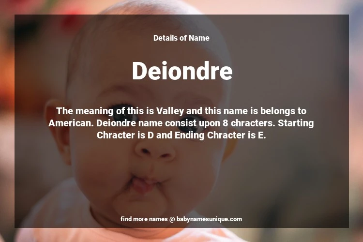 The name Deiondre is chosen by those who are willing to find Unique Transgenders Baby Names. The meaning of this is Valley and this name is belongs to American Origin. Baby Name Deiondre consist upon 8 chracters. Starting alphabet is D and ending alphabet is E. This name is used primarily by parents who are considering unique baby names for Transgenders. The Zodiac Sign suitbale for this name are;