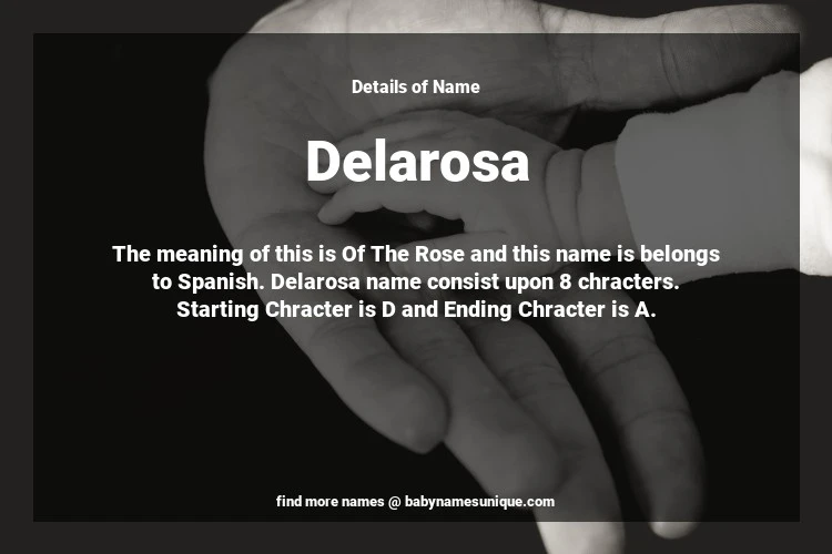 The name Delarosa is chosen by those who are willing to find Unique Transgenders Baby Names. The meaning of this is Of The Rose and this name is belongs to Spanish Origin. Baby Name Delarosa consist upon 8 chracters. Starting alphabet is D and ending alphabet is A. This name is used primarily by parents who are considering unique baby names for Transgenders. The Zodiac Sign suitbale for this name are;