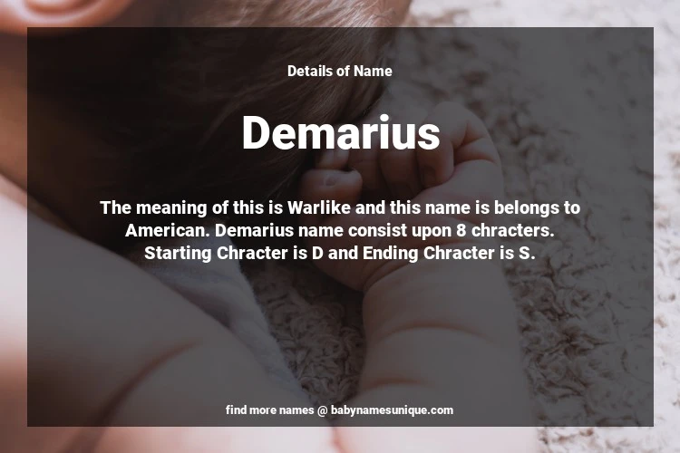 The name Demarius is chosen by those who are willing to find Unique Transgenders Baby Names. The meaning of this is Warlike and this name is belongs to American Origin. Baby Name Demarius consist upon 8 chracters. Starting alphabet is D and ending alphabet is S. This name is used primarily by parents who are considering unique baby names for Transgenders. The Zodiac Sign suitbale for this name are;