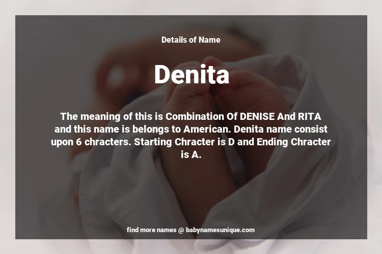 The name Denita is chosen by those who are willing to find Unique Transgenders Baby Names. The meaning of this is Combination Of DENISE And RITA and this name is belongs to American Origin. Baby Name Denita consist upon 6 chracters. Starting alphabet is D and ending alphabet is A. This name is used primarily by parents who are considering unique baby names for Transgenders. The Zodiac Sign suitbale for this name are;