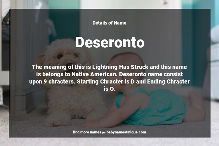The name Deseronto is chosen by those who are willing to find Unique Transgenders Baby Names. The meaning of this is Lightning Has Struck and this name is belongs to Native American Origin. Baby Name Deseronto consist upon 9 chracters. Starting alphabet is D and ending alphabet is O. This name is used primarily by parents who are considering unique baby names for Transgenders. The Zodiac Sign suitbale for this name are;