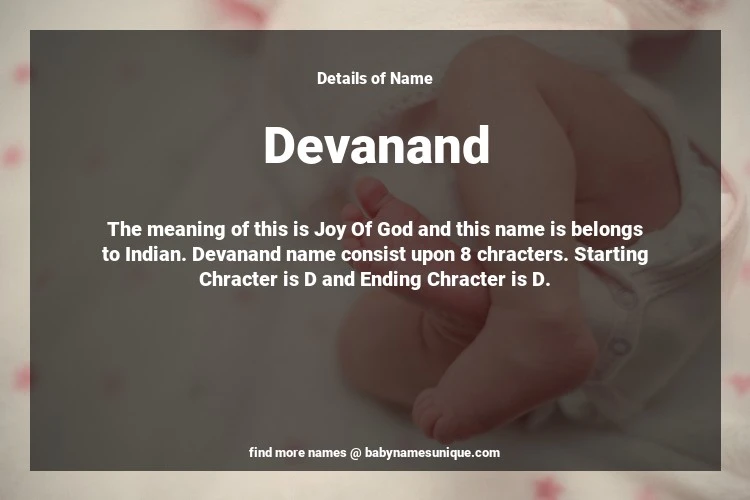 The name Devanand is chosen by those who are willing to find Unique Boy Baby Names. The meaning of this is Joy Of God and this name is belongs to Indian Origin. Baby Name Devanand consist upon 8 chracters. Starting alphabet is D and ending alphabet is D. This name is used primarily by parents who are considering unique baby names for Boy. The Zodiac Sign suitbale for this name are;