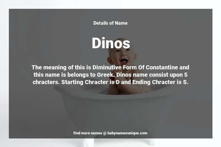 The name Dinos is chosen by those who are willing to find Unique Boy Baby Names. The meaning of this is Diminutive Form Of Constantine and this name is belongs to Greek Origin. Baby Name Dinos consist upon 5 chracters. Starting alphabet is D and ending alphabet is S. This name is used primarily by parents who are considering unique baby names for Boy. The Zodiac Sign suitbale for this name are;