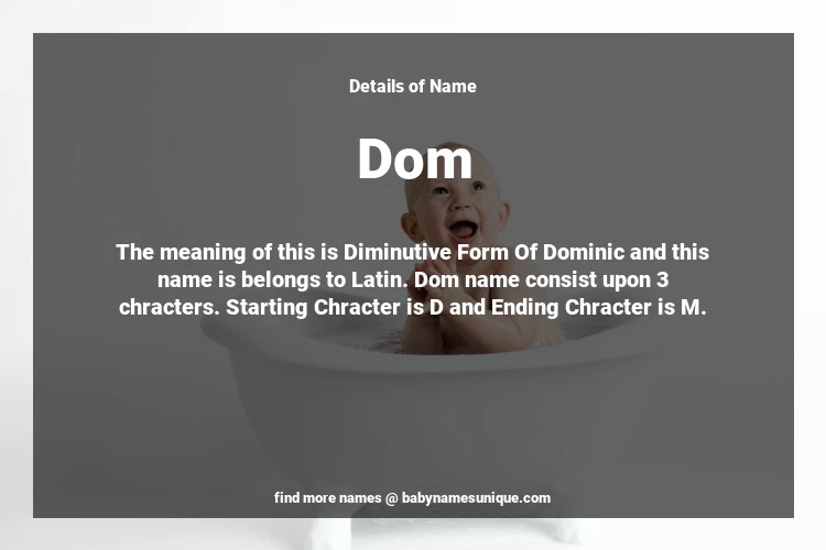 The name Dom is chosen by those who are willing to find Unique Boy Baby Names. The meaning of this is Diminutive Form Of Dominic and this name is belongs to Latin Origin. Baby Name Dom consist upon 3 chracters. Starting alphabet is D and ending alphabet is M. This name is used primarily by parents who are considering unique baby names for Boy. The Zodiac Sign suitbale for this name are;