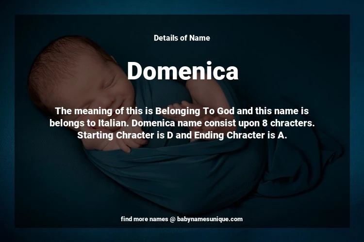 The name Domenica is chosen by those who are willing to find Unique Transgenders Baby Names. The meaning of this is Belonging To God and this name is belongs to Italian Origin. Baby Name Domenica consist upon 8 chracters. Starting alphabet is D and ending alphabet is A. This name is used primarily by parents who are considering unique baby names for Transgenders. The Zodiac Sign suitbale for this name are;