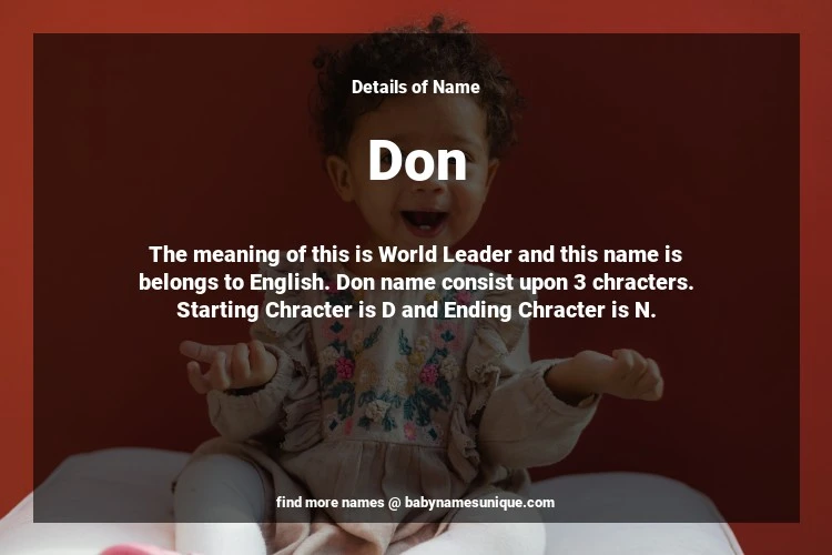 The name Don is chosen by those who are willing to find Unique Boy Baby Names. The meaning of this is World Leader and this name is belongs to English Origin. Baby Name Don consist upon 3 chracters. Starting alphabet is D and ending alphabet is N. This name is used primarily by parents who are considering unique baby names for Boy. The Zodiac Sign suitbale for this name are;