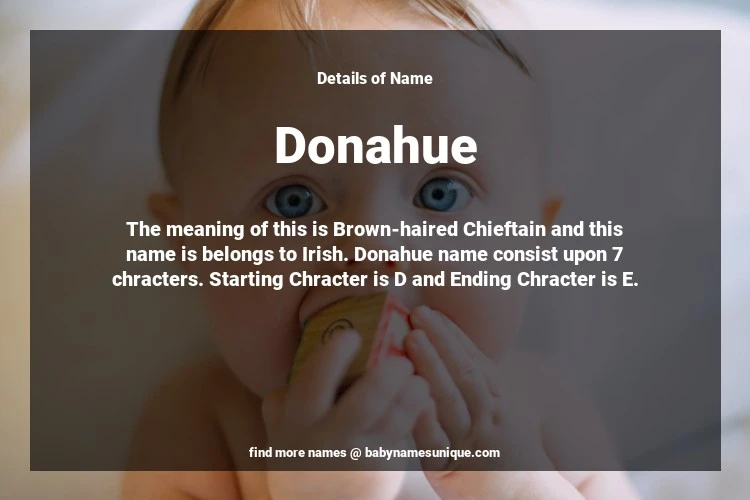 The name Donahue is chosen by those who are willing to find Unique Boy Baby Names. The meaning of this is Brown-haired Chieftain and this name is belongs to Irish Origin. Baby Name Donahue consist upon 7 chracters. Starting alphabet is D and ending alphabet is E. This name is used primarily by parents who are considering unique baby names for Boy. The Zodiac Sign suitbale for this name are;