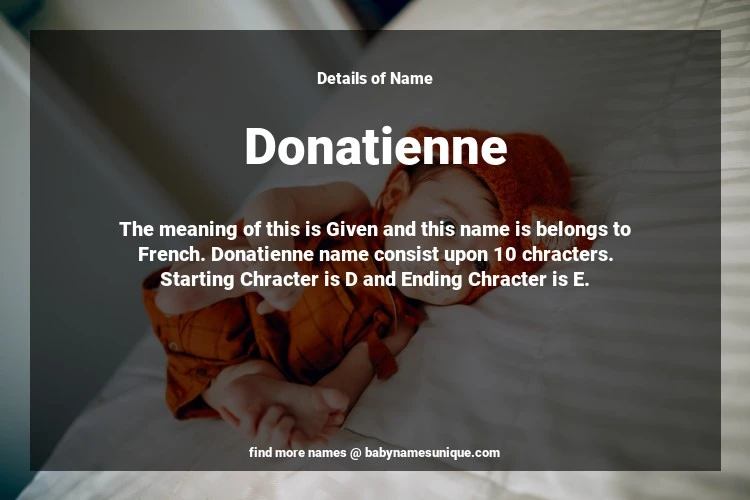 The name Donatienne is chosen by those who are willing to find Unique Transgenders Baby Names. The meaning of this is Given and this name is belongs to French Origin. Baby Name Donatienne consist upon 10 chracters. Starting alphabet is D and ending alphabet is E. This name is used primarily by parents who are considering unique baby names for Transgenders. The Zodiac Sign suitbale for this name are;