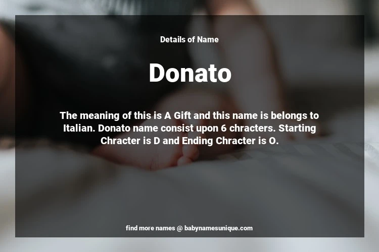 The name Donato is chosen by those who are willing to find Unique Boy Baby Names. The meaning of this is A Gift and this name is belongs to Italian Origin. Baby Name Donato consist upon 6 chracters. Starting alphabet is D and ending alphabet is O. This name is used primarily by parents who are considering unique baby names for Boy. The Zodiac Sign suitbale for this name are;