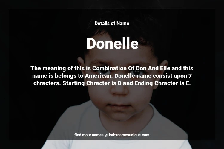 The name Donelle is chosen by those who are willing to find Unique Transgenders Baby Names. The meaning of this is Combination Of Don And Elle and this name is belongs to American Origin. Baby Name Donelle consist upon 7 chracters. Starting alphabet is D and ending alphabet is E. This name is used primarily by parents who are considering unique baby names for Transgenders. The Zodiac Sign suitbale for this name are;