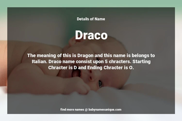 The name Draco is chosen by those who are willing to find Unique Boy Baby Names. The meaning of this is Dragon and this name is belongs to Italian Origin. Baby Name Draco consist upon 5 chracters. Starting alphabet is D and ending alphabet is O. This name is used primarily by parents who are considering unique baby names for Boy. The Zodiac Sign suitbale for this name are;