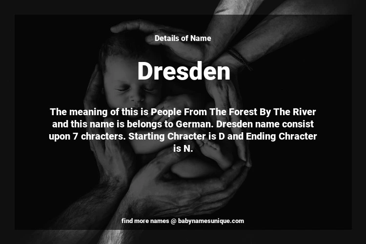 The name Dresden is chosen by those who are willing to find Unique Transgenders Baby Names. The meaning of this is People From The Forest By The River and this name is belongs to German Origin. Baby Name Dresden consist upon 7 chracters. Starting alphabet is D and ending alphabet is N. This name is used primarily by parents who are considering unique baby names for Transgenders. The Zodiac Sign suitbale for this name are;