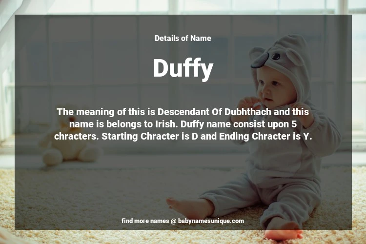 The name Duffy is chosen by those who are willing to find Unique Transgenders Baby Names. The meaning of this is Descendant Of Dubhthach and this name is belongs to Irish Origin. Baby Name Duffy consist upon 5 chracters. Starting alphabet is D and ending alphabet is Y. This name is used primarily by parents who are considering unique baby names for Transgenders. The Zodiac Sign suitbale for this name are;