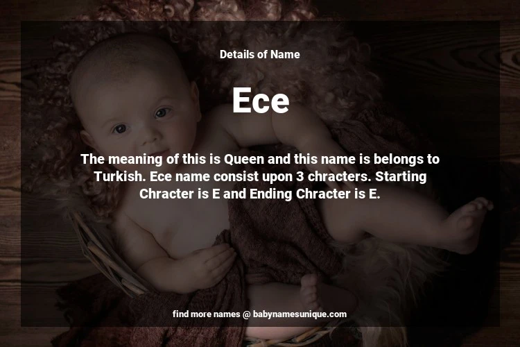 The name Ece is chosen by those who are willing to find Unique Transgenders Baby Names. The meaning of this is Queen and this name is belongs to Turkish Origin. Baby Name Ece consist upon 3 chracters. Starting alphabet is E and ending alphabet is E. This name is used primarily by parents who are considering unique baby names for Transgenders. The Zodiac Sign suitbale for this name are;