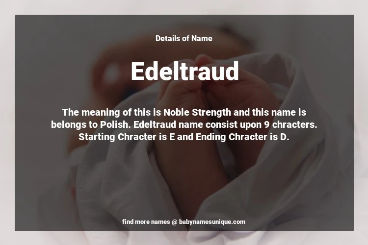 The name Edeltraud is chosen by those who are willing to find Unique Transgenders Baby Names. The meaning of this is Noble Strength and this name is belongs to Polish Origin. Baby Name Edeltraud consist upon 9 chracters. Starting alphabet is E and ending alphabet is D. This name is used primarily by parents who are considering unique baby names for Transgenders. The Zodiac Sign suitbale for this name are;