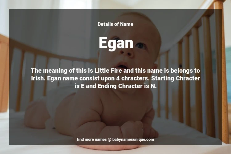 The name Egan is chosen by those who are willing to find Unique Boy Baby Names. The meaning of this is Little Fire and this name is belongs to Irish Origin. Baby Name Egan consist upon 4 chracters. Starting alphabet is E and ending alphabet is N. This name is used primarily by parents who are considering unique baby names for Boy. The Zodiac Sign suitbale for this name are;