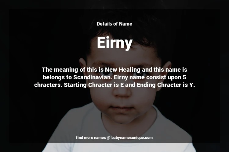 The name Eirny is chosen by those who are willing to find Unique Transgenders Baby Names. The meaning of this is New Healing and this name is belongs to Scandinavian Origin. Baby Name Eirny consist upon 5 chracters. Starting alphabet is E and ending alphabet is Y. This name is used primarily by parents who are considering unique baby names for Transgenders. The Zodiac Sign suitbale for this name are;