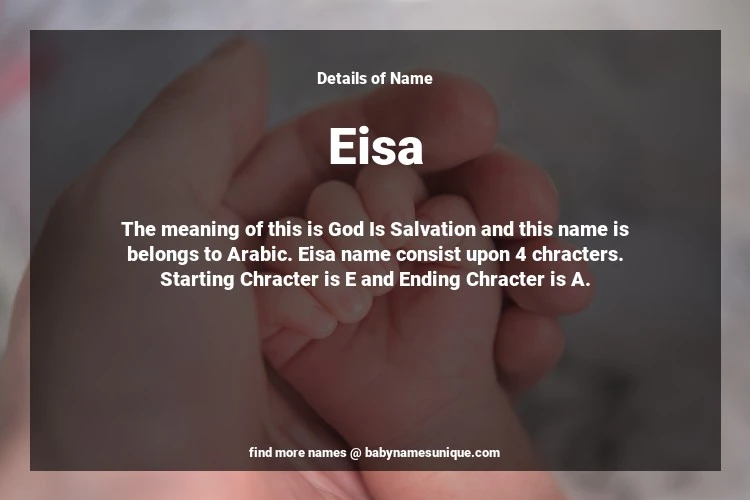 The name Eisa is chosen by those who are willing to find Unique Transgenders Baby Names. The meaning of this is God Is Salvation and this name is belongs to Arabic Origin. Baby Name Eisa consist upon 4 chracters. Starting alphabet is E and ending alphabet is A. This name is used primarily by parents who are considering unique baby names for Transgenders. The Zodiac Sign suitbale for this name are;